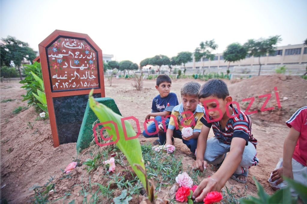 At twilight, they took us to the Shouhada Khan Sheikhoun cemetery, the monument to the martyrs of 15 05 2012, when 50 residents were killed in one day by a regime air strike. Three children, unaccompanied, knew exactly what to do: they croached down, laid flowers on the bare earth, then stood up and turned their palms upwards, in prayer, until the awkward eye contact happened through the lens.D isturbed by our encroachment on their privacy, they left, and so we did, Feeling like vultures circling on a funeral